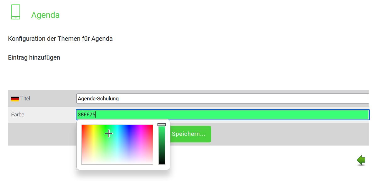 Vergib anschließend den Namen des Themas. Ebenfalls kannst du hier, um später im Frontend die Themen optische besser hervorzuheben, eine individuelle Farbe für jedes Thema vergeben. Diese wird in der Übersicht aller Agendapunkte am unteren Rand dargestellt. Wenn du das System zweisprachig nutzt, kannst du hier auch die englische Variante hinterlegen. Bitte verzichte hier auf HTML-Codes oder Sonderzeichen, da diese die Darstellung innerhalb des Frontends beeinträchtigen könnten. Klicke anschließend auf "Speichern" und wiederhole diesen Vorgang entsprechend oft deiner vorhandenen Themen.
