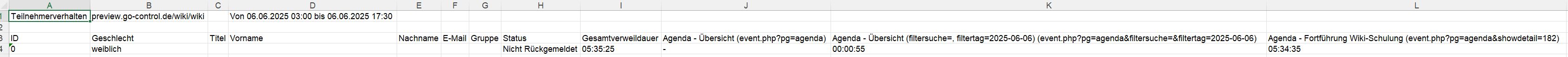 Gib hier einen Start- und einen End-Zeitpunkt an, wähle im Pulldown anschließend den gewünschten Menü-Punkt und exportiere anschließend mit "Liste erzeugen" eine Excel-Datei. In dieser Liste kannst du, je nach tracking-Zustimmung, einsehen, welcher Datensatz sich wann und wie lange auf den einzelnen Seiten aufgehalten und bewegt hat.