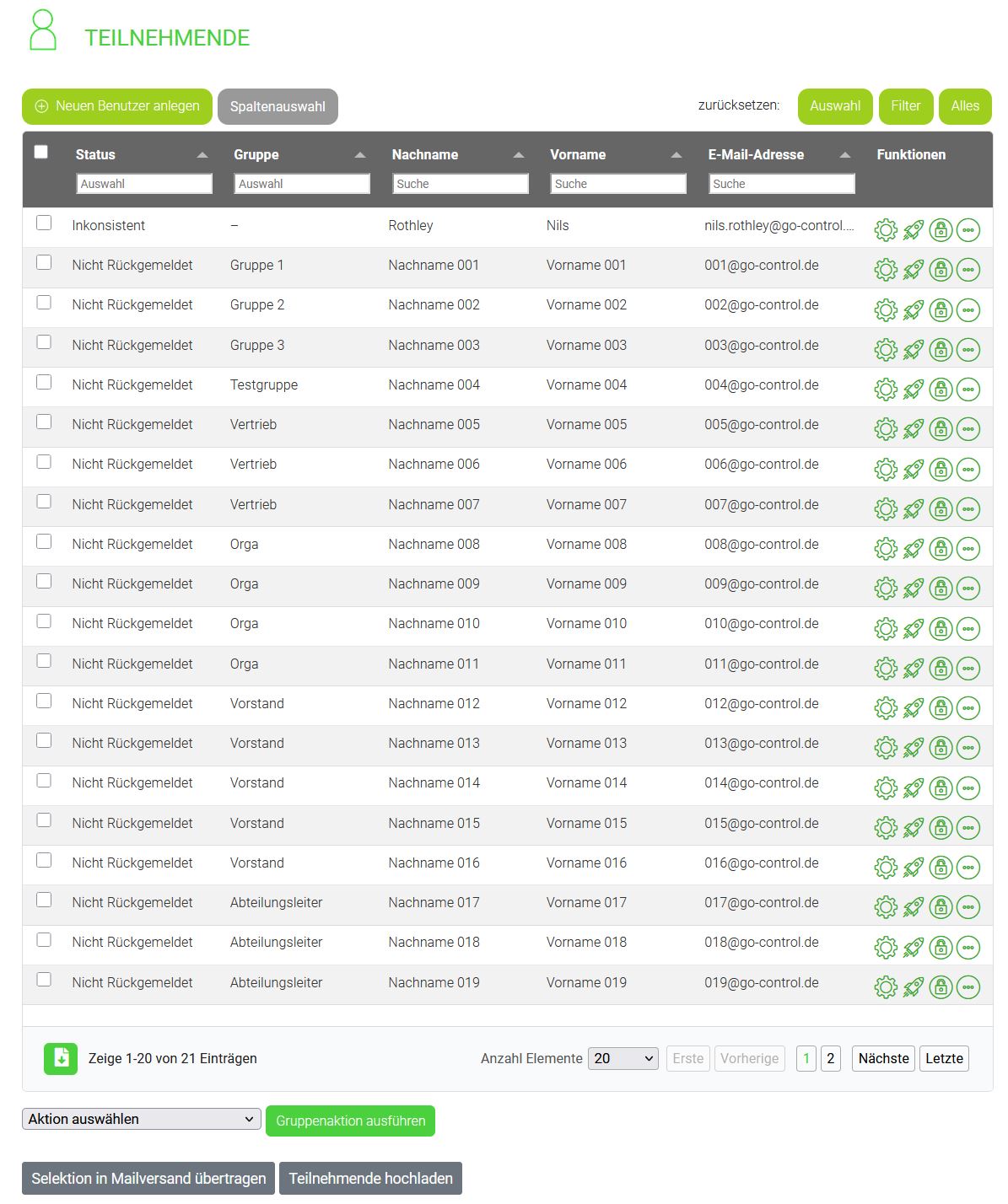 Um nach bestimmen Werten zu Filtern, steht über jeder Spalte ein Filter zur Verfügung. Je nach Spalte, variieren diese nach Textsuche oder Pulldown. Bei z.B. Status und Gruppe kannst du einem Pulldown nach den vorhandenen Werten filtern - bei Vor- & Nachnamen, sowie der E-Mail - Adresse gibt es eine Textsuche.