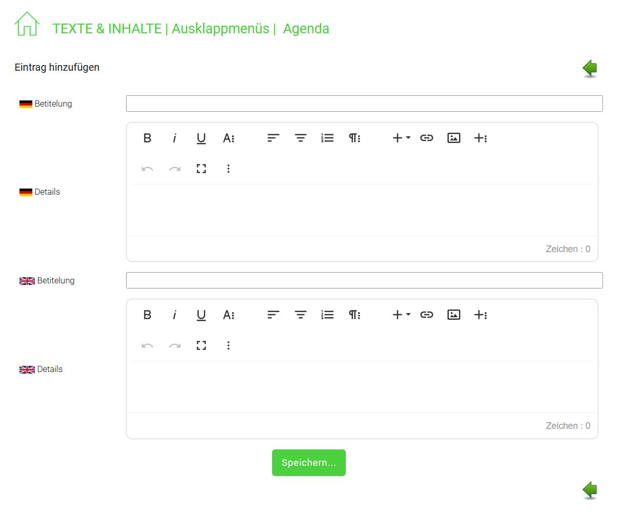 • Um ein neues Ausklappmenü anzulegen, klicke zunächst auf das grüne Plus-Symbol. Fülle unter „Betitelung“ die Überschrift oder die Frage ein, die zu sehen sein soll. Unter „Details“ fülle anschließend die Informationen ein, die erscheinen, wenn man den Menüpunkt ausklappt. Mit den Editor-Funktionen, die recht stark an MS Word erinnern, kannst du deine Texte formatiere, Verlinkungen, Tabellen, Platzhalter oder Bilder einfügen. Fahre mit dem Mauszeiger einfach über die Symbole, um zu erfahren, was sich hinter den Punkten verbirgt.